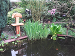 - In een prachtige tuin exposeren wij .Dolf met houtsculpturen en ik met keramiek
